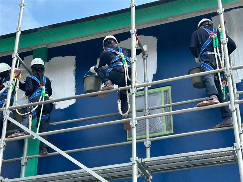 下塗りは塗料の密着性を高め、仕上がりの品質を大きく左右する重要な作業です。研修生たちは安全帯を装着し足場に上がり、講師の指導を受けながら丁寧に作業を進めていました。